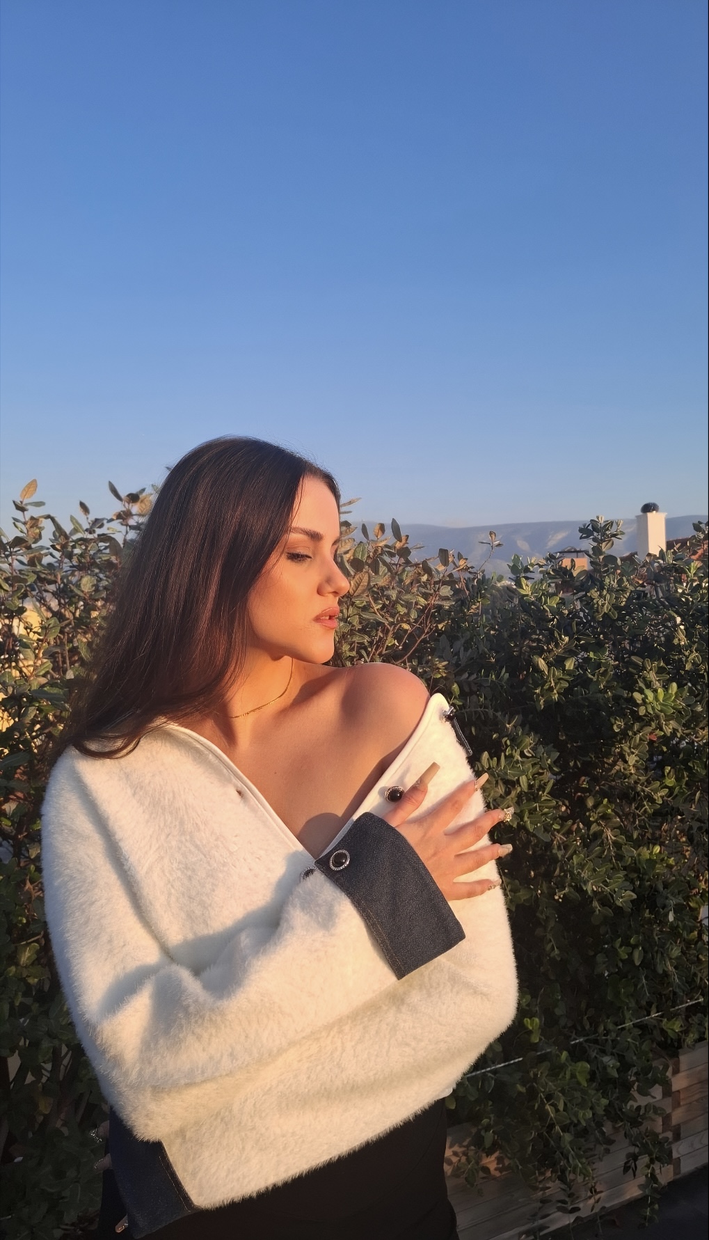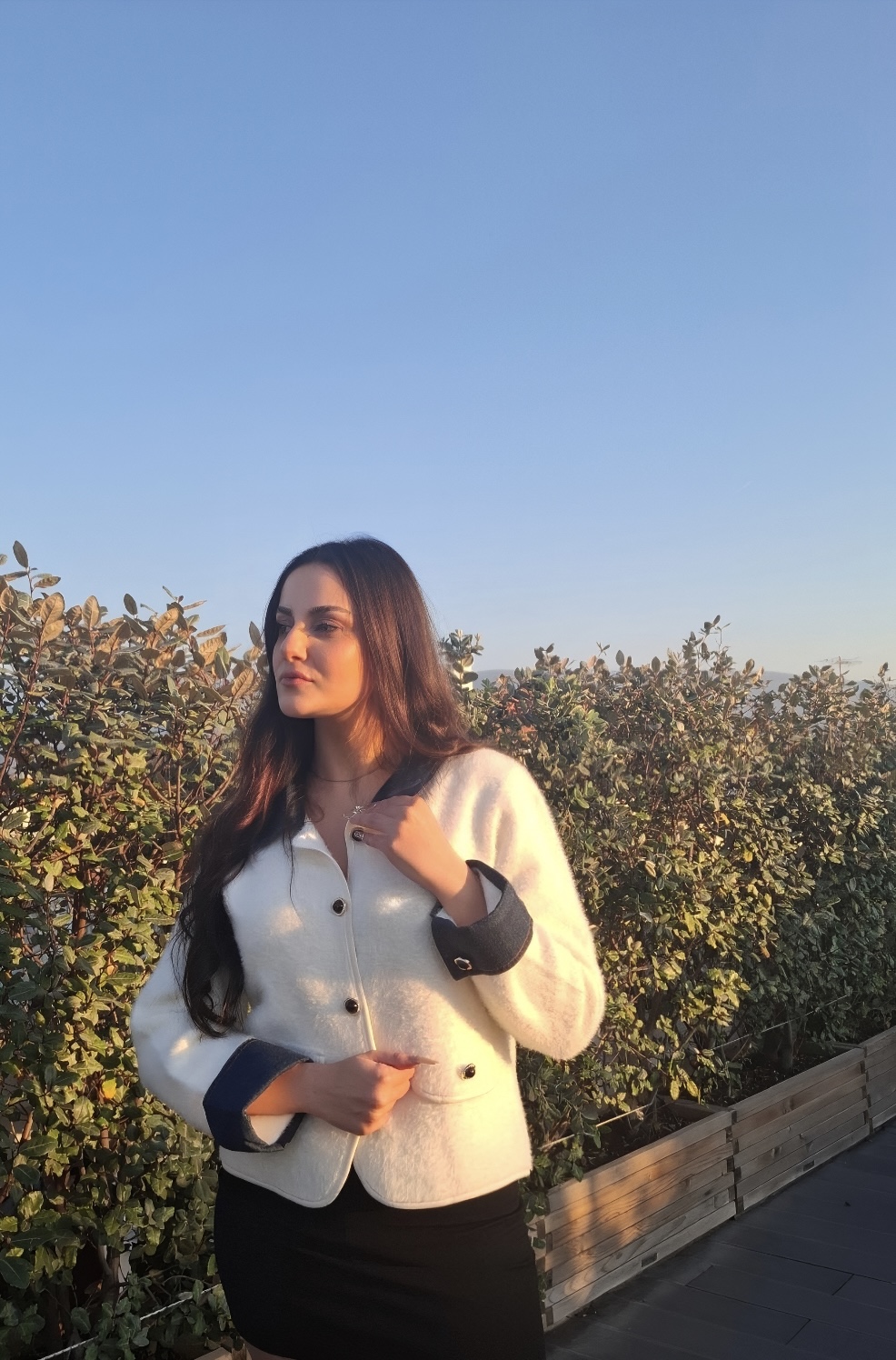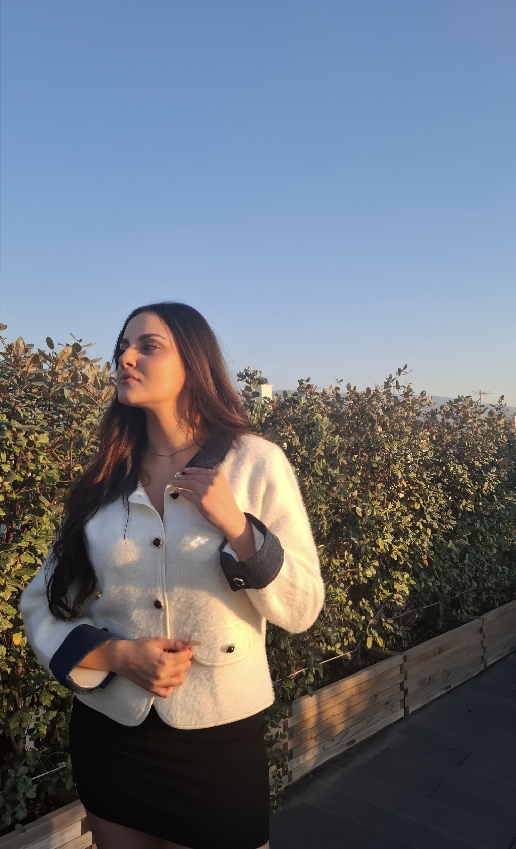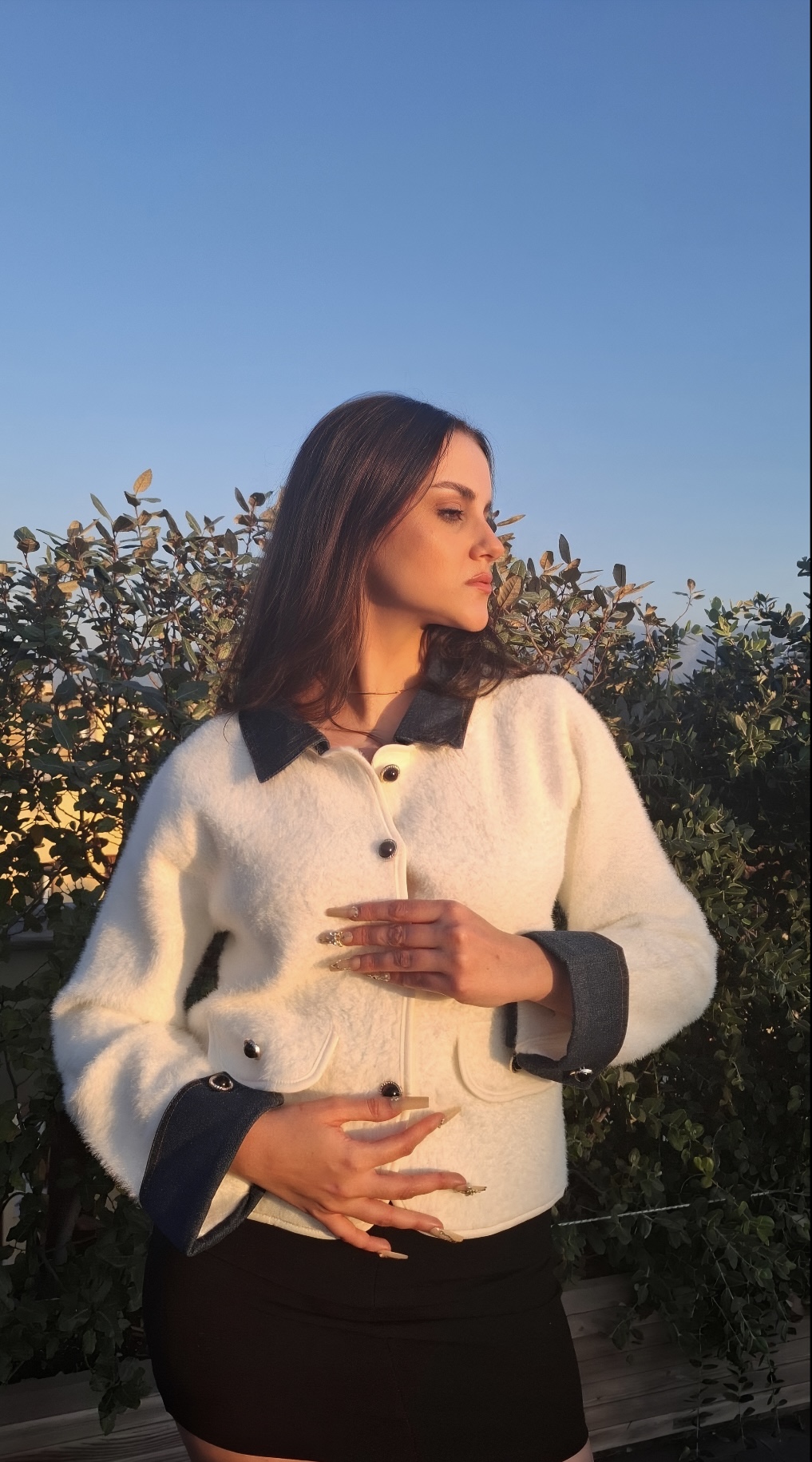 Μοντέρνα και κομψή ζακέτα με αντίθεση χρωμάτων: λευκό σώμα και σκούρα μπλε τζιν μανίκια και γιακά, για ένα διαχρονικό και μοντέρνο look.