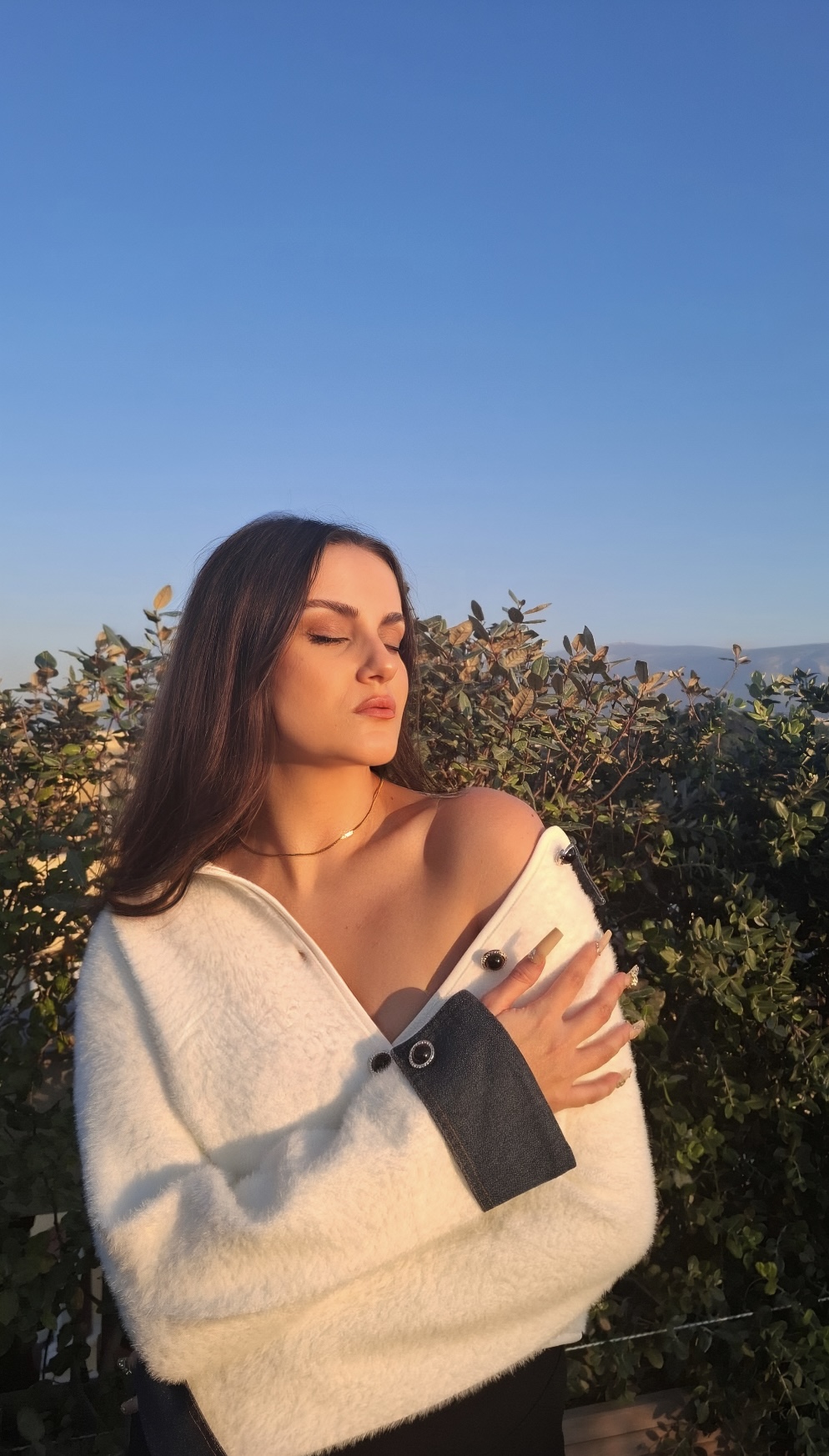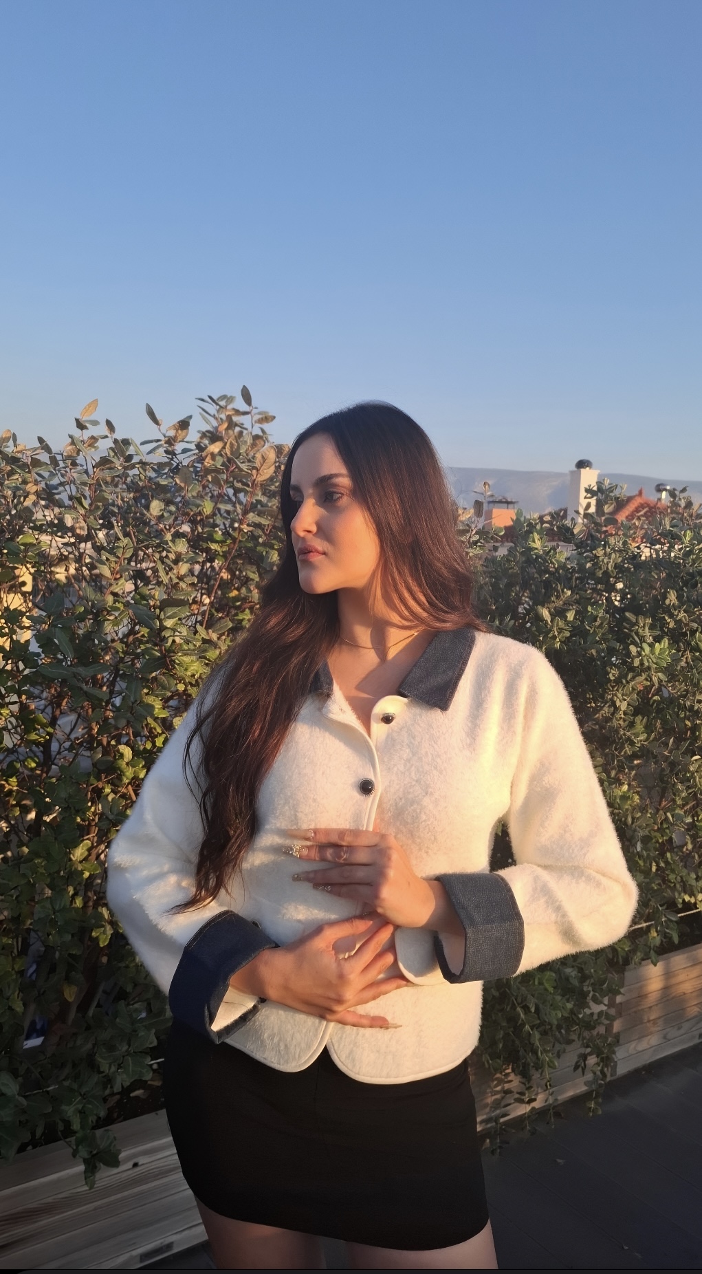 Μοντέρνα και κομψή ζακέτα με αντίθεση χρωμάτων: λευκό σώμα και σκούρα μπλε τζιν μανίκια και γιακά, για ένα διαχρονικό και μοντέρνο look. Διακοσμημένη με μαύρα κουμπιά με χρυσό φινίρισμα γύρω γύρω, που προσθέτουν διακριτική πολυτέλεια και λάμψη. Ιδανική για καθημερινές εμφανίσεις ή πιο επίσημες περιστάσεις. One size